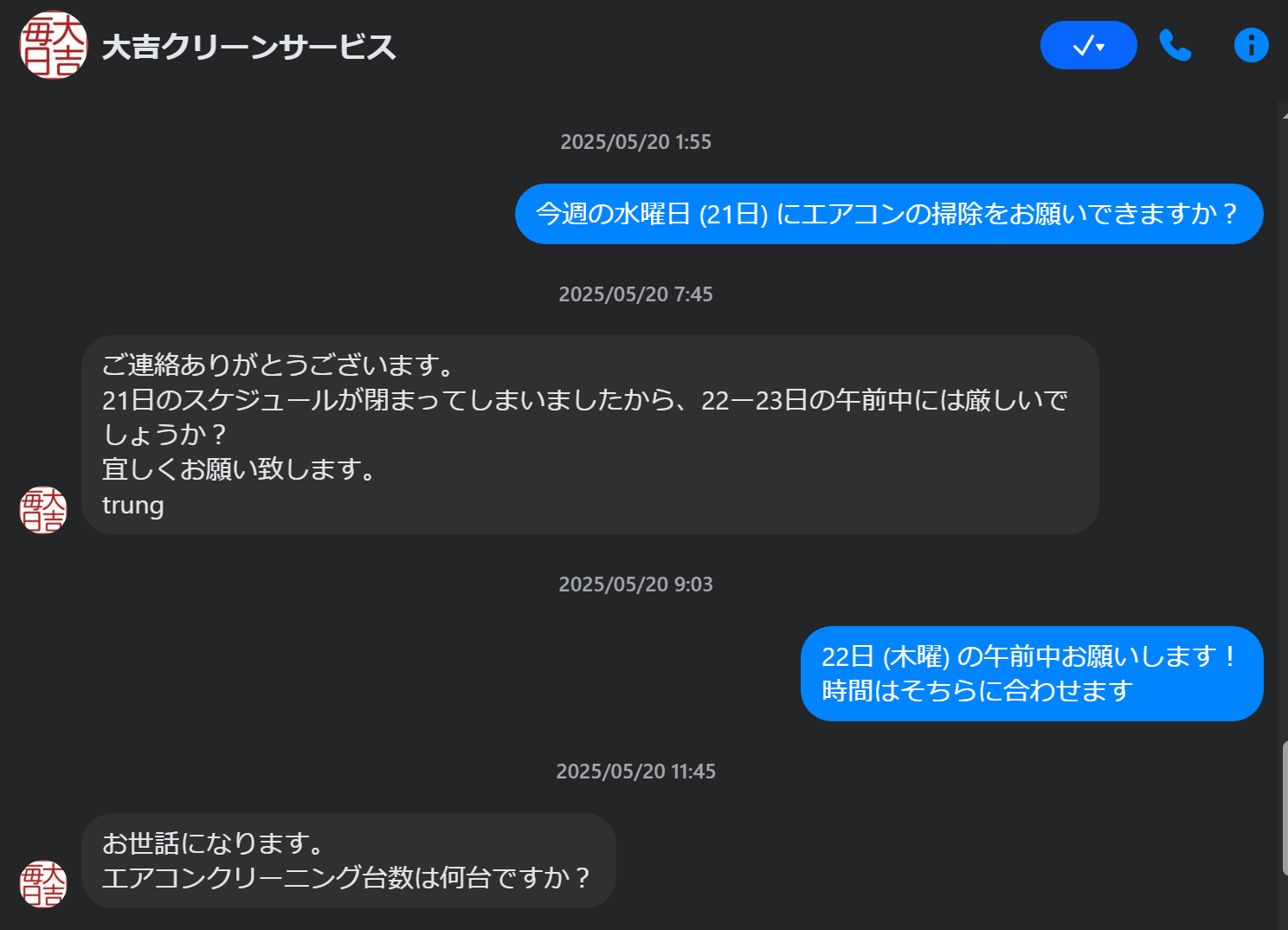 サービスが終わっていたら… これからのエアコン清掃をどうしよう… と絶望と挨拶しながらもFB メッセンジャーで依頼すると返事が来ました。
